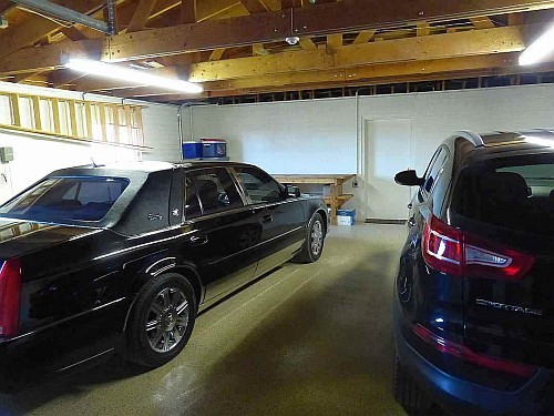 The garage has a beautiful epoxy floor coating. The garage can accommodate large vehicles such as a 1 ton Chevy crew cab pick-up and/or Suburban sized vehicle. The 2 large spaces provide extra width and extended length. Electric door openers ease entry and the 2 exterior windows provide daylight to the garage. |